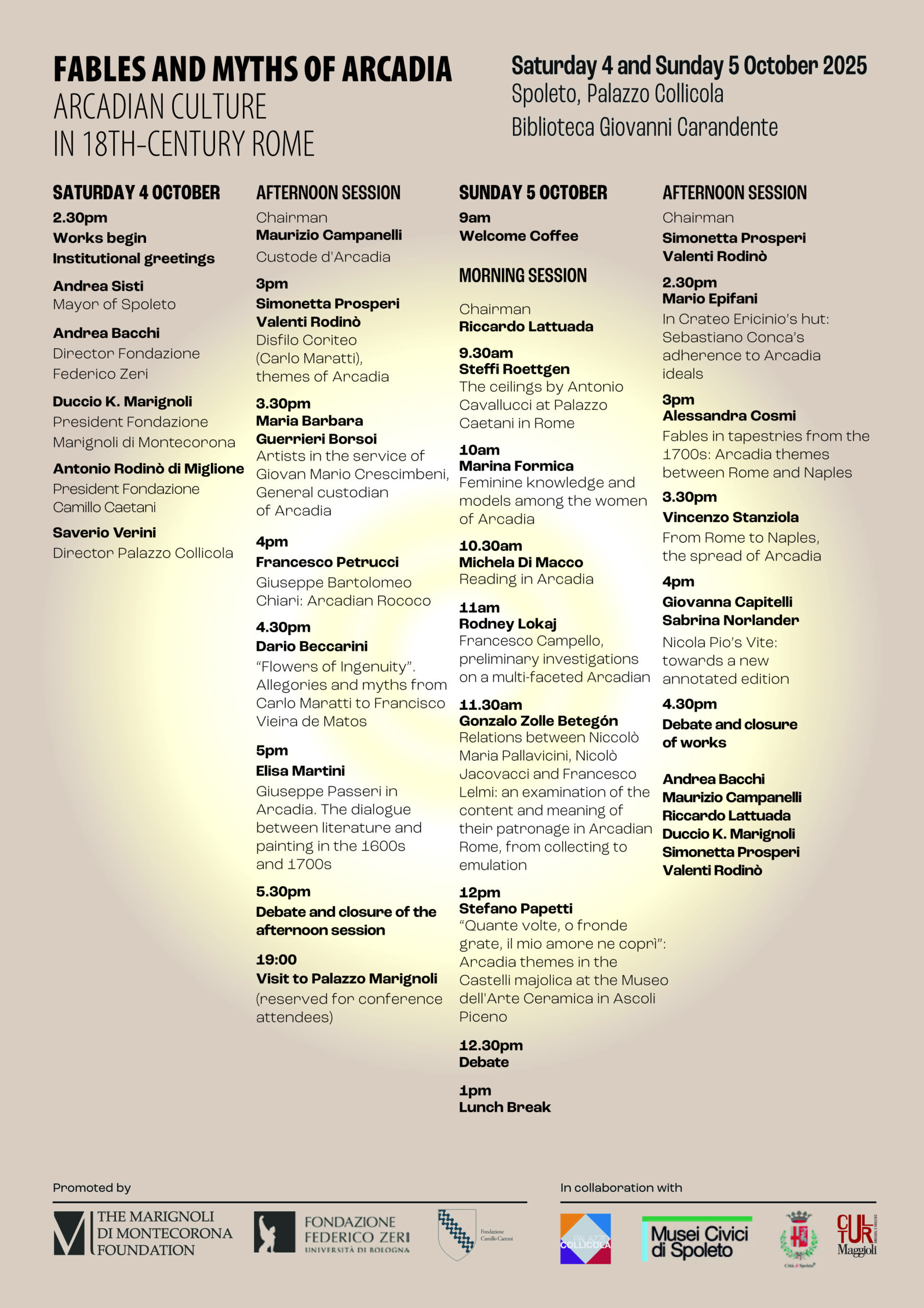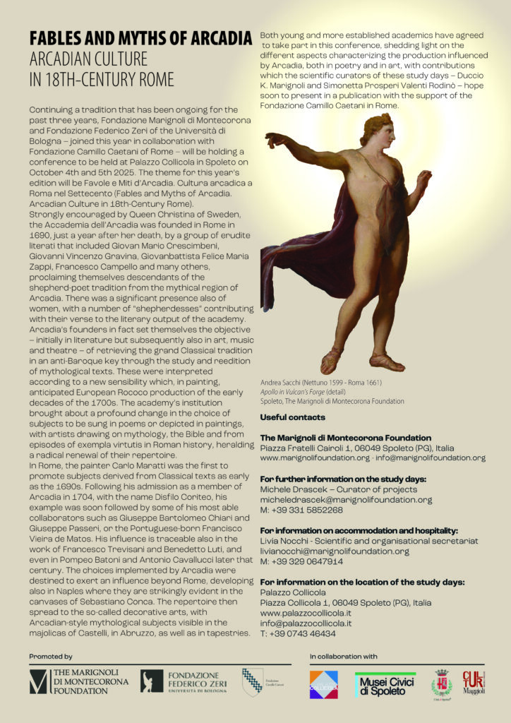 Continuing a tradition that has been ongoing for the past three years, Fondazione Marignoli di Montecorona and Fondazione Federico Zeri of the Università di Bologna – joined this year in collaboration with Fondazione Camillo Caetani of Rome – will be holding a conference to be held at Palazzo Collicola in Spoleto on October 4th and 5th 2025. The theme for this year’s edition will be Favole e Miti d’Arcadia. Cultura arcadica a Roma nel Settecento (Fables and Myths of Arcadia. Arcadian Culture in 18th-Century Rome).